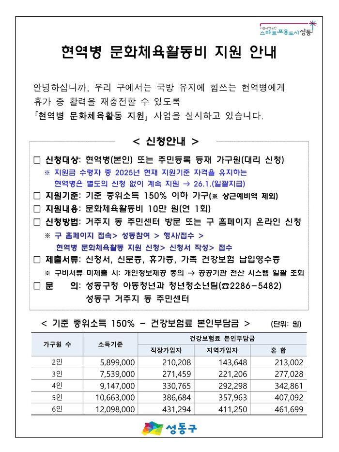 | ▲ 현역병 문화체육활동비 지원 안내문. (사진=성동구청 제공) |