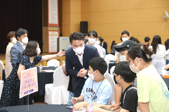 | ▲ 청소년참여예산총회에 참석한 오언석 구청장이 아이들과 이야기를 나누고 있는 모습. (사진제공=도봉구청) |