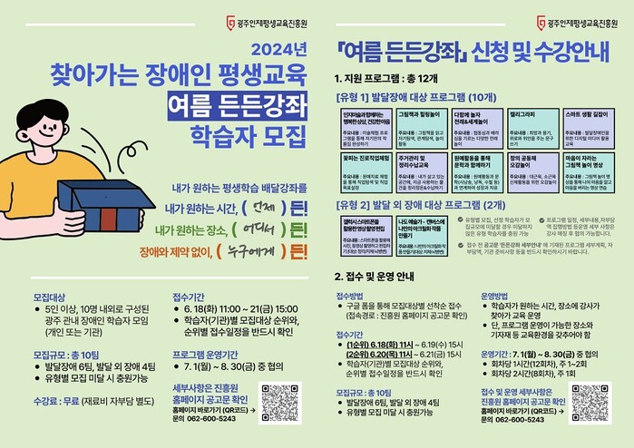 [광주=정찬남 기자] (재)광주인재평생교육진흥원(원장 이춘문, 이하 ‘진흥원’)이 ‘2024년 여름 든든강좌’에 참여할 장애인 학습자와 기관을 모집한다.
