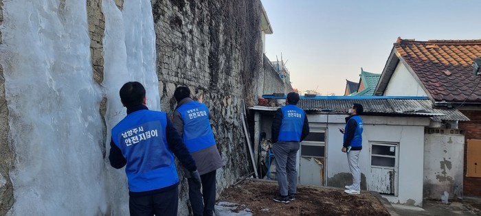 경기 남양주시 다산행정복지센터는 지난 21일 안전 점검의 날을 맞아 주택가 옹벽 및 축대(담장)에 대해 시민안전자문단과 함께 합동점검을 실시했다. 사진은 이날 참여한 안전지킴이들이 점검을 하고 있는 모습. (사진제공=남양주시청)