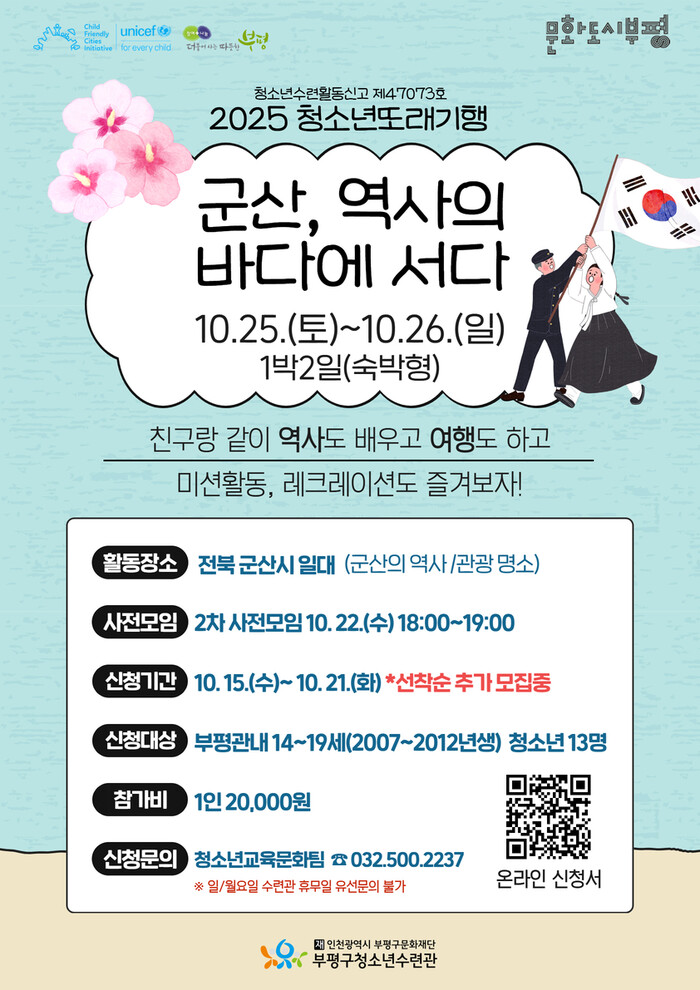 [인천=문찬식 기자] 인천 부평구(구청장 차준택) 청소년수련관은 오는 21일까지 ‘2025 청소년 또래기행 - 군산, 역사의 바다에 서다’에 참가할 청소년을 모집한다.