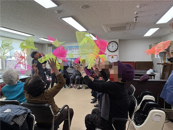 | ▲ 스카프를 활용한 실버놀샘터 프로그램 진행 모습. (사진=구로구청 제공) |