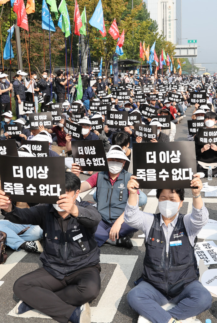 서울교통공사노조가 29일 서울시청 앞에서 신당역 사망 역무원 추모제를 하고 있다.