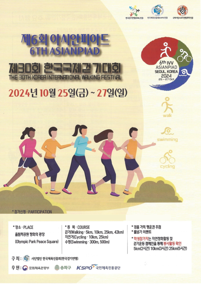 특히 금년에 진행하는 한국국제걷기대회는 한국에 걷기운동을 최초로 도입하여 국제대회로 개최한지 30년이 되는 특별한 의미가 있는 해로 2년을 주기로 아시아시민스포츠연맹이 개최하는 제6회 아시안피아드 행사를 서울에 유치 특별 이벤트로 함께 진행하게 된다.