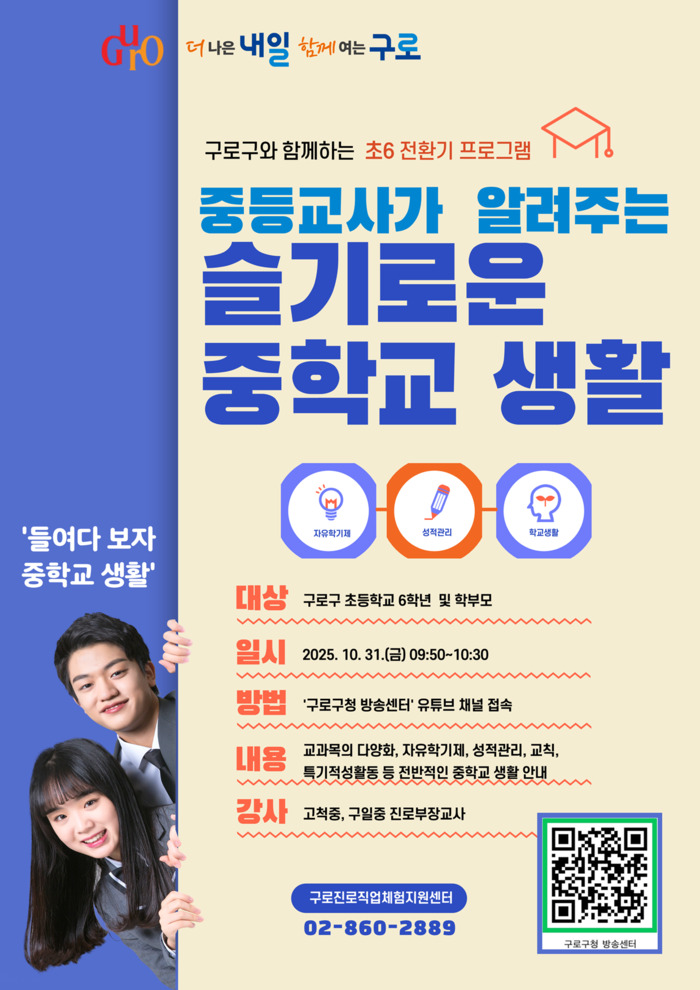 [시민일보 = 박소진 기자] 서울 구로구(구청장 장인홍)가 31일 초등학교 6학년 학생과 학부모를 대상으로 중학교 입학 전 알아야 할 주요 정보를 안내하는 ‘슬기로운 중학교 생활’ 프로그램을 유튜브 생방송으로 운영한다.