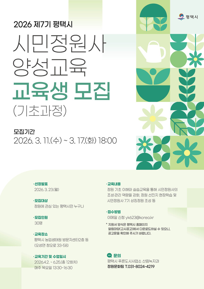 정장선 시장은 “시민정원사는 정원 도시 평택을 만드는 중요한 동력”이라며 “지난해 2025 제13회 경기정원문화박람회의 성공적인 개최 과정에서도 시민정원사들이 조성과 운영, 정원문화 확산 등 다양한 분야에서 핵심적인 역할을 한 만큼, 올해도 많은 시민이 참여해 함께 정원문화를 만들어가길 바란다”라고 전했다.