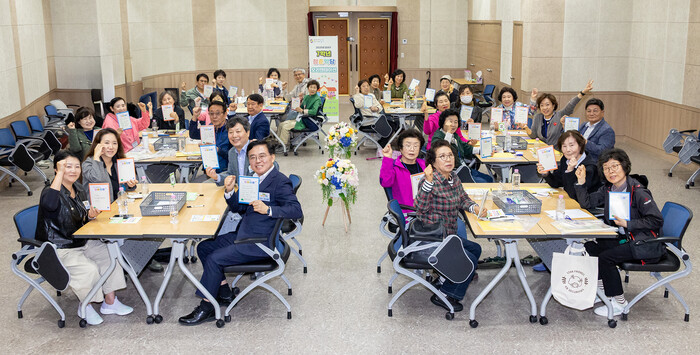 진교훈 서울 강서구청장이 최근 은퇴 후에도 사회활동을 활발하게 이어가는 액티브 시니어를 위한 ‘7학년 청춘학당’ 강좌 개강식에 참석했다. 이날 강서평생학습관에서 열린 개강식에는 65세 이상 노인 30여명이 참석했다. 사진은 진 구청장(앞줄 왼쪽 두 번째)이 수강생들과 기념 촬영을 하는 모습. (사진=강서구청 제공)