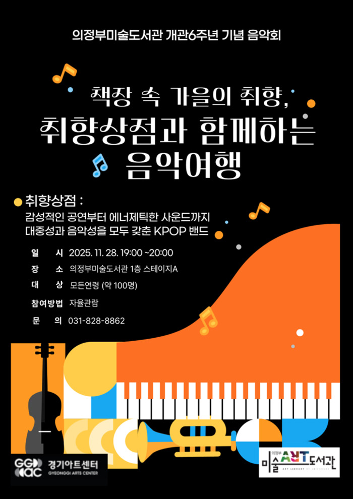 [시민일보 = 민장홍 기자] 경기 의정부미술도서관은 개관 6주년을 맞이해 오는 28일 오후 7시부터 8시까지 1층 스테이지A에서 밴드 ‘취향상점’과 함께하는 음악회를 개최한다.