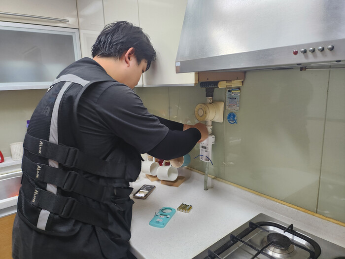 | ▲ 대상자 가구에 가스밸브 자동잠금장치를 설치하고 있는 모습. (사진=도봉구청 제공) |
