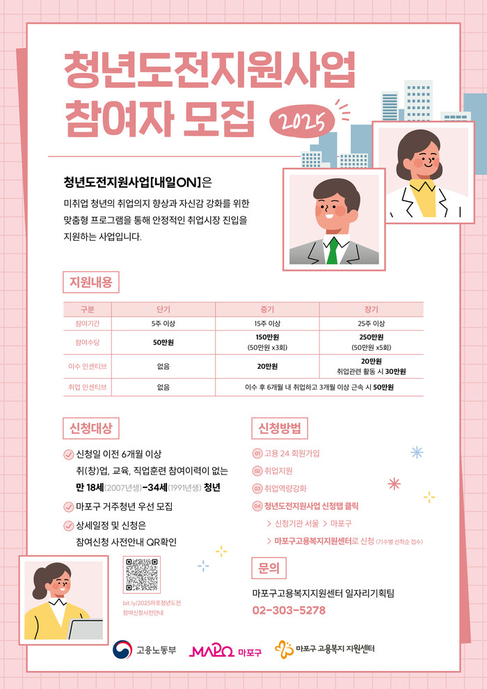 [시민일보 = 문민호 기자] 서울 마포구(구청장 박강수)는 구직활동에 어려움을 겪는 청년을 위해 ‘청년도전 지원사업’의 참여자를 모집한다고 13일 밝혔다.