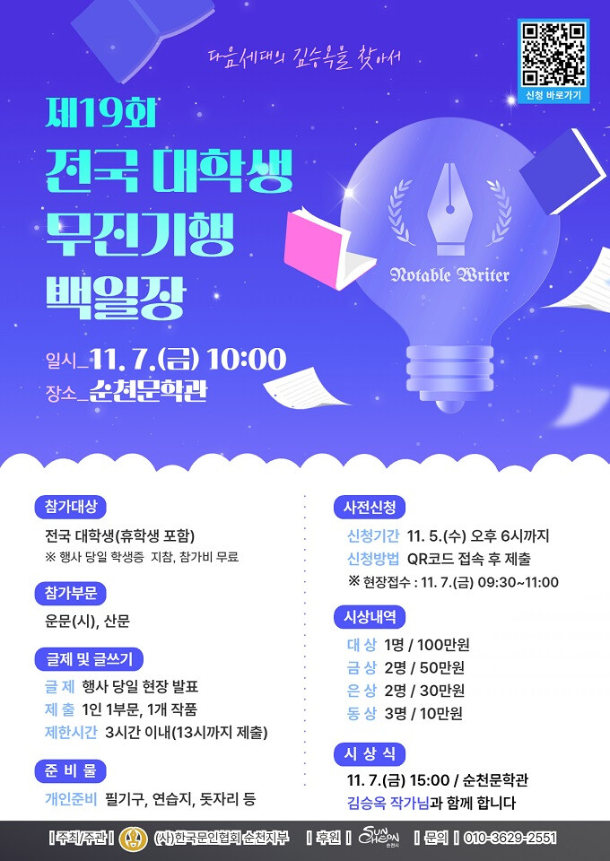 시상식은 행사 당일 오후 3시 순천문학관 야외무대에서 진행되며, 대상 1명(100만원), 금상 2명(각 50만원), 은상 2명(각 30만원), 동상 3명(각 10만원)을 수여할 예정이다.