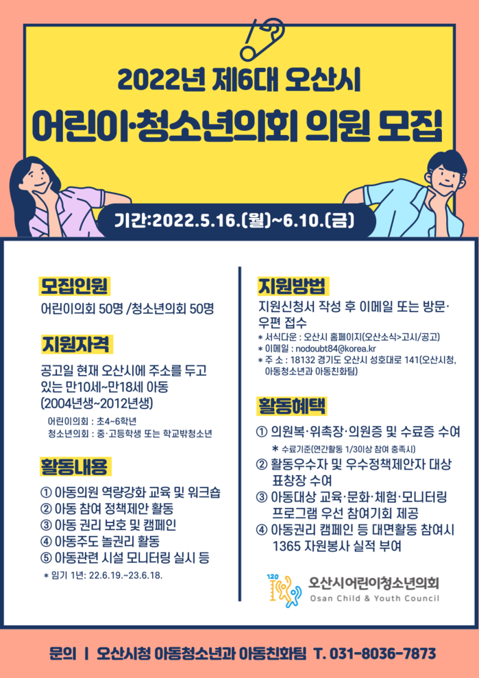 참여 신청은 오산시청 홈페이지를 참고해 이메일(nodoubt84@korea.kr) 또는 우편으로 접수할 수 있으며, 기타 궁금한 사항은 오산시 아동청소년과로 문의하면 된다.