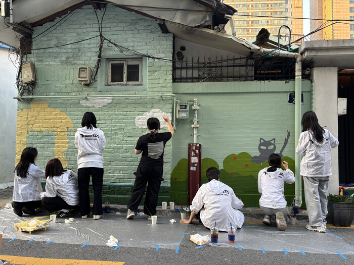 | ▲ 용신동 주택가 벽을 꾸미고 있는 동국대학교 페인터즈. (사진=동대문구청 제공) |
