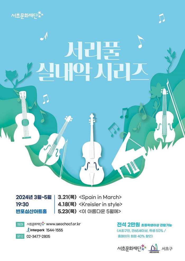 서초문화재단의 2024년 기획공연 <서리풀 실내악 시리즈>는 전석 2만원으로 자세한 사항은 서초문화재단 공식 홈페이지를 통해서 확인이 가능하다.