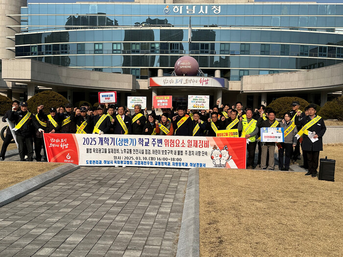 | ▲ 10일 ‘2025 개학기(상반기) 학교 주변 위험요소 일제정비’에 참여한 관계자들이 기념 촬영을 하고 있다. (사진=하남시청 제공) |