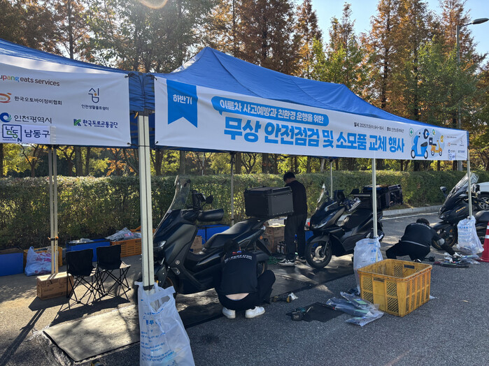 [인천=문찬식 기자] 인천 남동구는 쿠팡이츠 서비스와 협업해 혹한기 대비 이륜차 무상 안전점검 및 소모품 교체 캠페인을 했다고 6일 밝혔다.