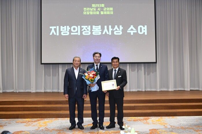 | ▲ 이기우 해남군의회 의원이 11일 전남 고흥군에서 열린 제293회 전라남도시군의회 의장협의회에서 지방의정 봉사상을 수상하고 기념촬영을 하고 있다. / 왼 쪽부터 김석순 해남군의회 의장, 이기우 의원 등 |