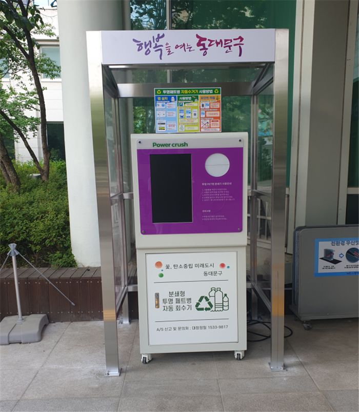 구청사, 동대문종합사회복지관, 이문체육문화센터, 동대문구민체육센터 각 1대씩 총 4곳에 설치된 ‘투명페트병 무인회수기’에 투입된 페트병은 얇은 플라스틱 조각으로 분쇄돼 가방, 의류를 만들 수 있는 고품질의 원료로 재탄생한다.