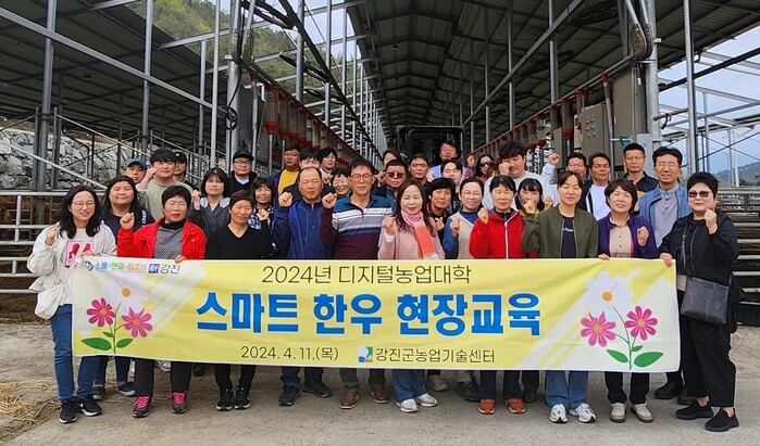 | ▲ 강진군, 지난 4월 11일 관내 한우농가 대상 디지털농업대학 스마트한우과정 현장 교육 기념촬영 자료사진 / 강진군 제공 |