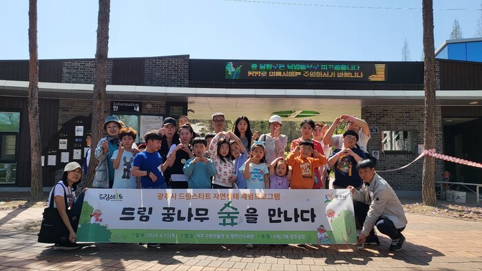 | ▲ 지난 13일 진행된 ‘드림 꿈나무 숲을 만나다’ 자연 생태체험 프로그램 참가자들이 기념촬영을 하고 있는 모습. (사진=광주시청 제공) |