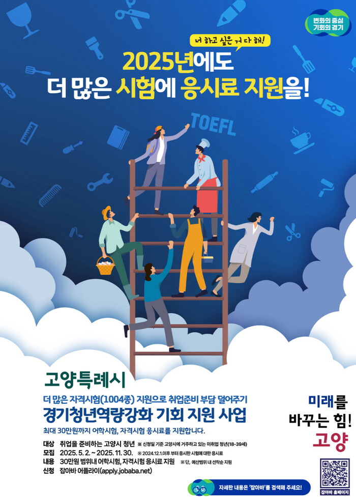 [시민일보 = 민장홍 기자] 경기 고양시가 미취업 청년에게 어학ㆍ자격시험 응시료를 지원하는 ‘경기청년 역량강화 기회지원 사업’을 실시한다고 28일 밝혔다.