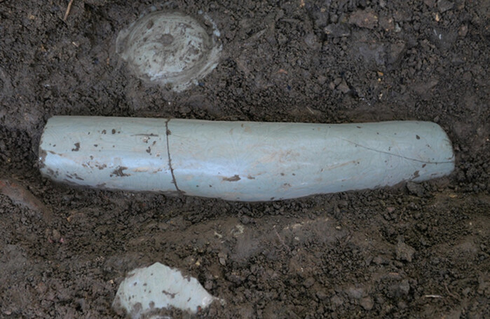 강진 청자 ‘大平명’ 양각해석류화문와는 강진 청자 요지인 사당리 발굴품으로 휘어진 모양의 청자로 매우 희귀하다.