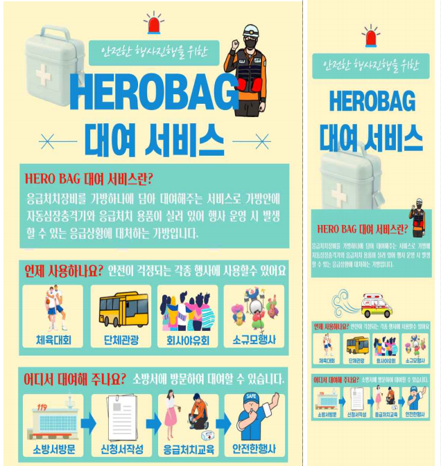 ’HERO BAG 대여 서비스‘는 행사를 주최하는 단체 및 기관에서 응급처치 장비를 대여하여 자체 안전을 확보하고 안전한 행사 진행을 함으로써 응급상황에 신속하게 대응하기 위해 추진 됐다.