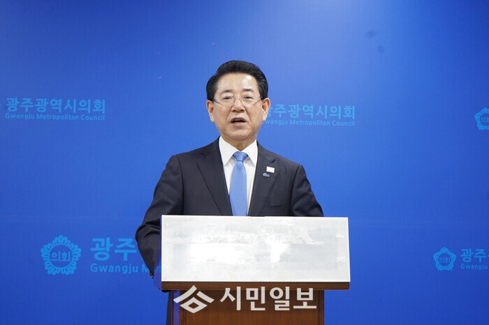 | ▲ 김영록 민주당 전남광주특별시장 예비후보가 31일 광주시의회에서 경선과 관련, “모든 예비후보들을 포용하는 ‘통합지방정부’ 개념으로 전남광주특별시 운영을 선언하고 있다. / 김영록 예비후보 캠프 제공 |