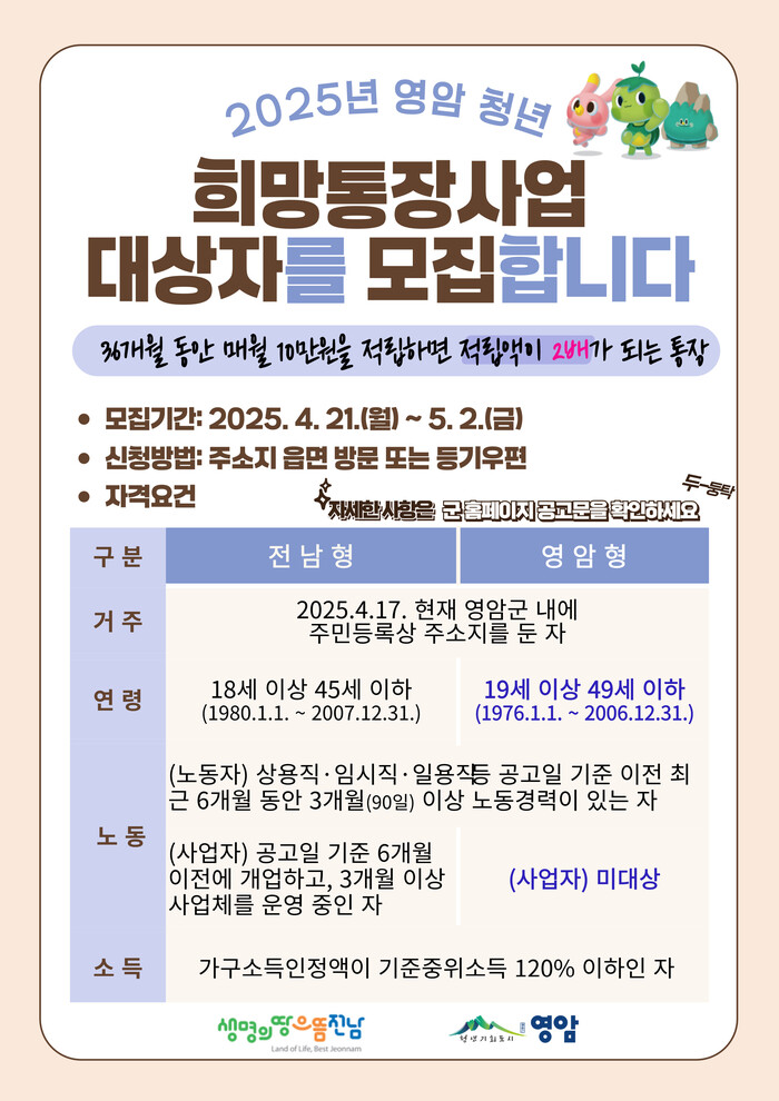 군민인 18~49세 청년 누구나 참여할 수 있는 이 사업은 ‘전남형’ 36명과 ‘영암형’ 55명 모집으로 구성돼 있고, 중복 신청할 수 없어 사전에 신청 자격을 꼼꼼히 살펴야 한다.