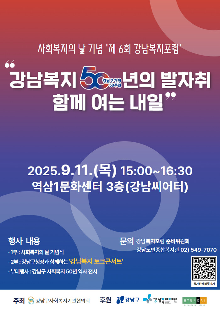 이번 행사는 강남구 개청 50주년과 제26회 사회복지의 날(9월7일)을 기념해, 지난 반세기 동안의 강남 복지를 돌아보고 미래 비전을 함께 논의하는 자리다.