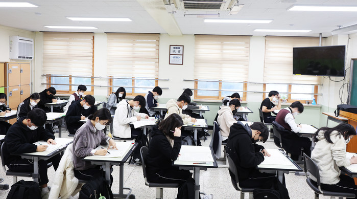2022학년도 11월 고2 전국연합학력평가가 실시된 23일 오전 경기도 수원시 효원고등학교 2학년 교실에서 학생들이 시험을 보고 있다.
