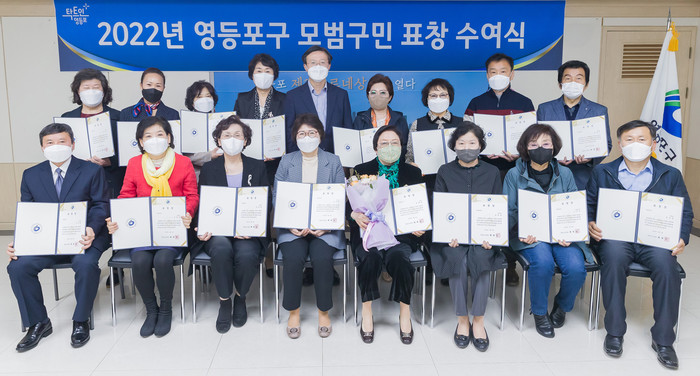 영등포구는 지난 8일 구청에서 '2022년 4월 영등포구 모범구민 표창 수여식'을 열었다. 사진은 채현일 구청장(뒷줄 가운데) 및 모범구민들이 기념촬영을 하는 모습. (사진제공=영등포구청)