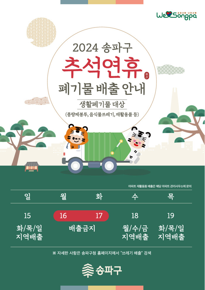 [시민일보 = 이대우 기자] 서울 송파구(구청장 서강석)가 9~19일 추석 연휴 기간 쓰레기 배출 안내와 지역 대청소 등 청소종합대책을 추진한다.