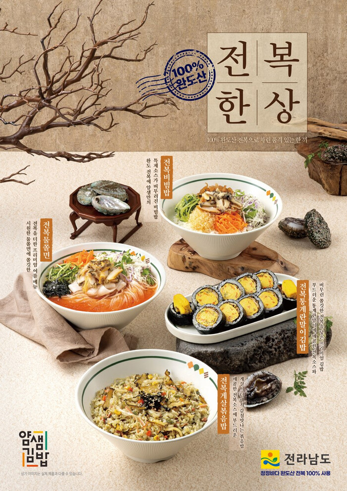 이번에 얌샘 김밥에서 출시 예정인 메뉴는 전복계란말이김밥, 전복비빔밥, 전복게살볶음밥, 전복물쫄면 총 4종이다. 100% 전남의 살아있는 전복만을 사용하며, 소비자 선호에 맞춰 연구와 테스트를 통해 메뉴를 개발했다.