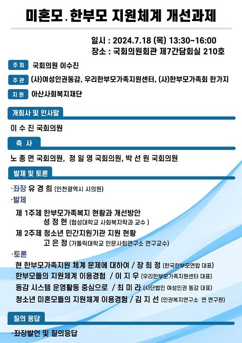 관계자는 “이번 토론회를 통해 정책의 한계를 보완하며, 특히 자녀를 양육하는 모든 가정 특히 재가 한부모.미혼모 당사자들이 걱정 없이 자녀를 양육하고 건강하게 자립할 수 있는 계기를 마련하고자 한다”고 전했다.