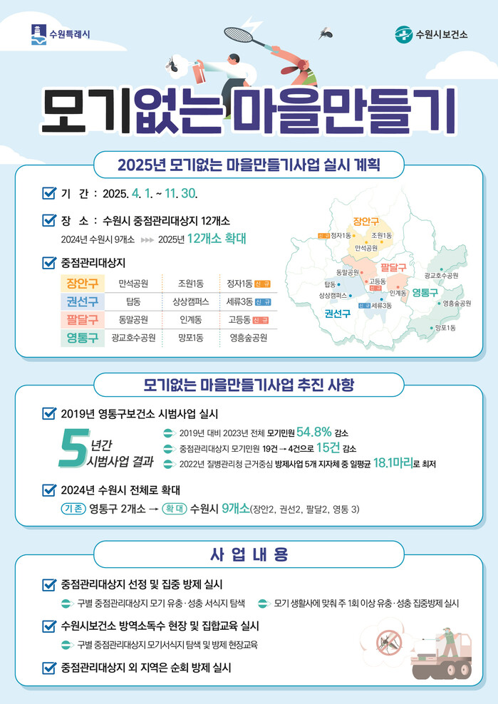 2024년 모기 민원은 48건으로 2019년(113건)보다 57.5% 감소했고, 중점관리대상이었던 광교호수공원과 망포1동의 모기 민원은 2019년 19건에서 2023년 4건으로 줄었다.