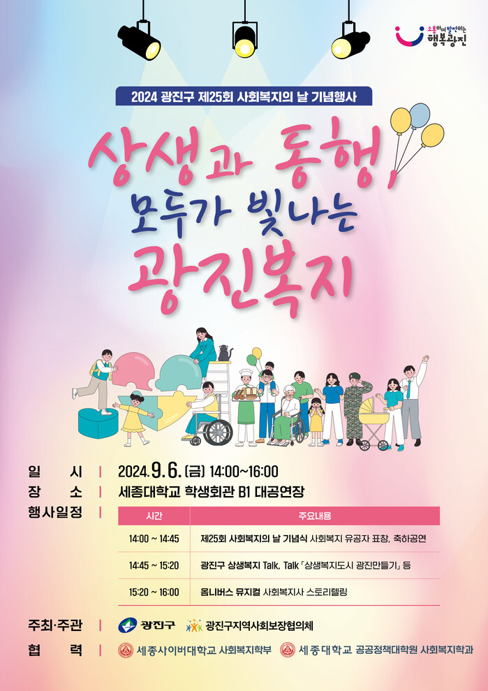 이번 행사는 광진구와 광진구지역사회보장협의체가 주관하고, 세종대학교 공공정책대학원 사회복지학과와 세종사이버대학교 사회복지학부가 함께 협력하는 상생의 축제라는 점에서 큰 의미가 있다.
