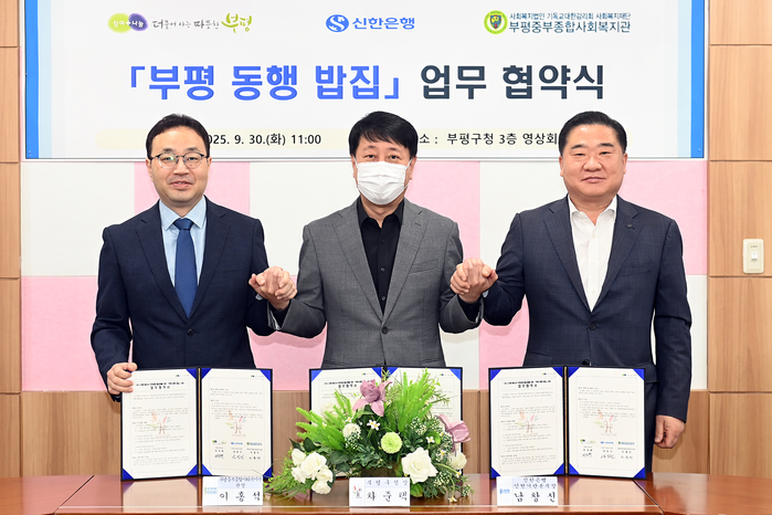 [인천=문찬식 기자] 인천 부평구가 9월30일 구청에서 신한은행ㆍ부평중부종합사회복지관과 ‘부평 동행 밥집’ 사업 추진 관련 업무 협약을 체결했다.