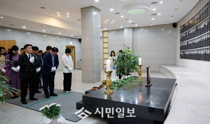 | ▲ 이정선 광주광역시교육감과 명진 광주시의회 교육문화위원장, 울란바토르 방문단이 몽골 학생독립운동 기념회관 특별 전시실에 마련된 희생자들을 위해 국화꽃을 헌화 한 후 추모묵념을 하고 있다. / 광주광역시교육청 제공 |
