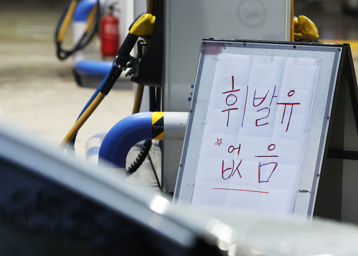 화물연대 파업의 여파로 주유소 휘발유 공급에 차질이 생긴 28일 경기도 수원시의 한 주유소에 문구가 부착돼 있다. 4대 정유사(SK, GS칼텍스, 에쓰오일, 현대오일뱅크) 차량 중 70~80%가 화물연대 조합원이어서 재고가 떨어진 주유소의 휘발유와 경유 공급에도 차질이 빚어질 것으로 예상된다.