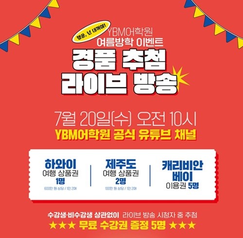 경품 추첨 라이브 방송은 오늘 7월 20일 수요일, 오전10시에 유튜브 YBM어학원 공식채널에서 만나볼수 있다. 이번 방송에는 인기 개그맨과 수강생 모델이 함께 진행할 예정이다.