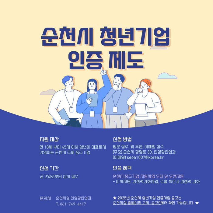 청년 인증을 바라는 기업은 시청 홈페이지 고시ㆍ공고란의 ‘2025년 순천시 청년기업 인증사업’ 공고문을 참고해 신청서를 작성한 후 이메일, 우편 접수 또는 신성장산업과에 방문, 연중 제출하면 된다.