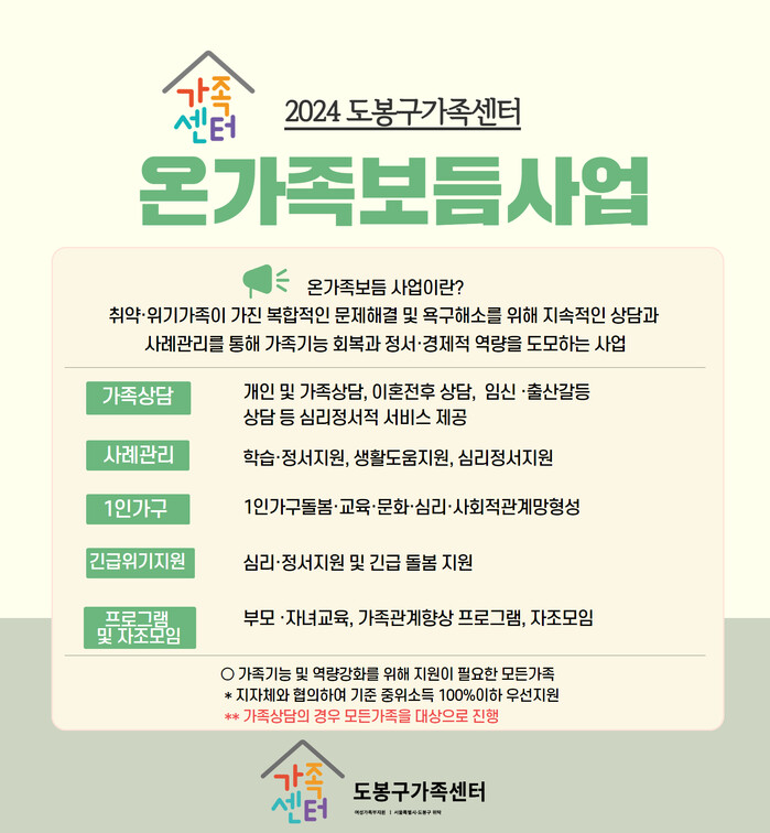온가족보듬사업 신청 등 자세한 사항은 도봉구가족센터 또는 홈페이지를 통해 확인할 수 있다.
