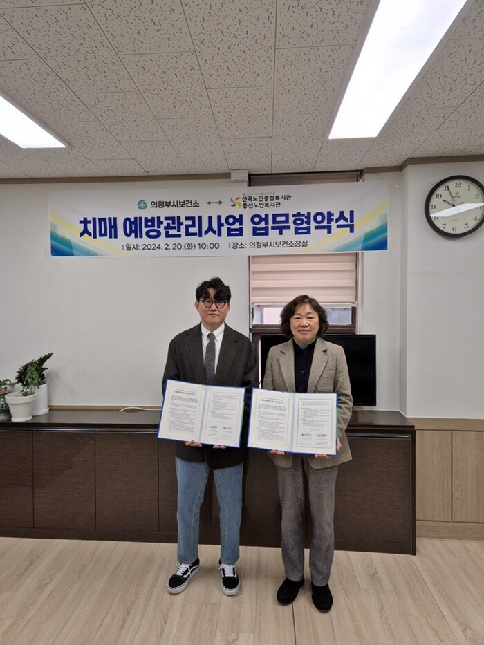 경기 의정부시 보건소가 지난 20일 신곡·흥선노인복지관과 지역사회 치매예방관리사업의 효과를 높이기 위한 업무협약을 체결했다. 협약에 따라 치매예방 및 인식개선사업, 가족지원사업, 치매조기검진사업 등에 협력하기로 했다. 사진은 협약식에서 관계자들이 기념촬영을 하고 있는 모습. (사진=의정부시청 제공)