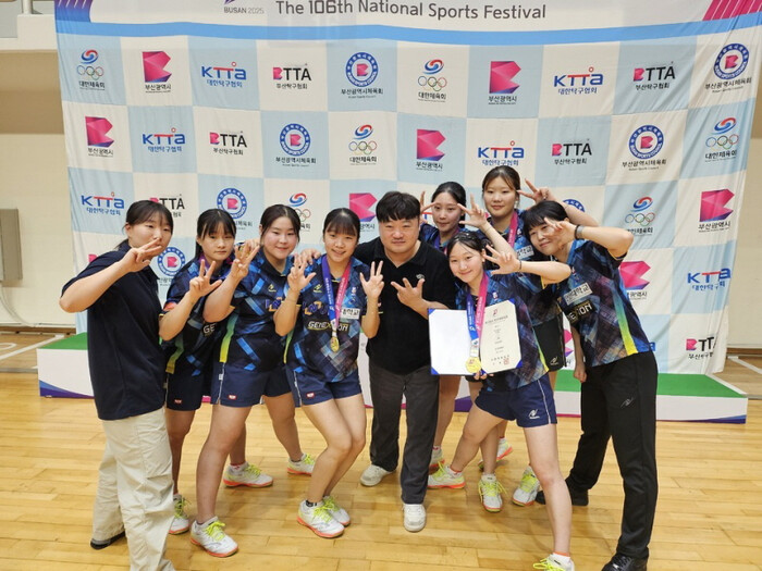 | 제106회 전국체육대회 탁구 단체전에서 3년연속 금메달을 획득한 인천대 선수들이 포즈를 취하고 있다. (사진=인천대) |