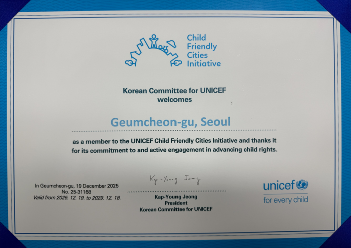 이어 “이번 재인증 획득을 계기로 아동들의 목소리를 경청하고 건강한 성장을 체계적으로 지원하겠다”라며 “금천구를 어른과 아이 모두 행복한 도시로 발전시켜 나가겠다”라고 밝혔다.