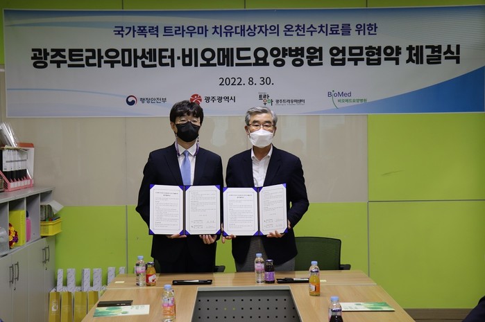 [광주=정찬남 기자] 광주트라우마센터는 30일 화순 비오메드요양병원과 ‘국가폭력 트라우마 치유 대상자의 온천수치료 프로그램 이용을 위한 업무협약’을 체결했다.