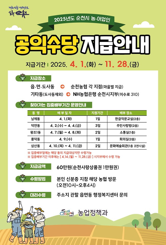 농어민 공익수당은 연 60만원이 지급되며, 지역경제 활성화를 위해 순천사랑상품권으로 제공된다. 올해 순천시 공익수당 지급 대상자는 총 1만5718명이며, 예산 규모는 약 94억원에 달한다.