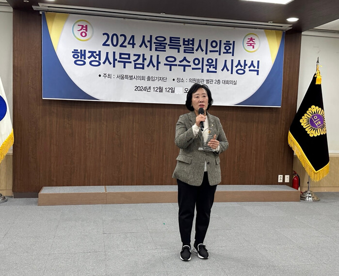 | ▲ 2024 행정사무감사 우수의원상을 수상한 신복자 의원이 수상 소감을 하고 있는 모습. (사진=서울시의회 제공) |