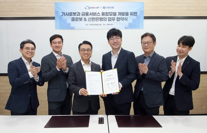 | ▲ 지난 25일 성남시 분당구 소재 클로봇 본사에서 '가사로봇과 금융서비스 융합모델 개발'을 위한 업무협약을 체결하고 강대오 신한은행 자산관리솔루션그룹장(왼쪽 세번째), 김창구 클로봇 대표이사(오른쪽 세번째) 및 관계자들이 기념 촬영하는 모습 |